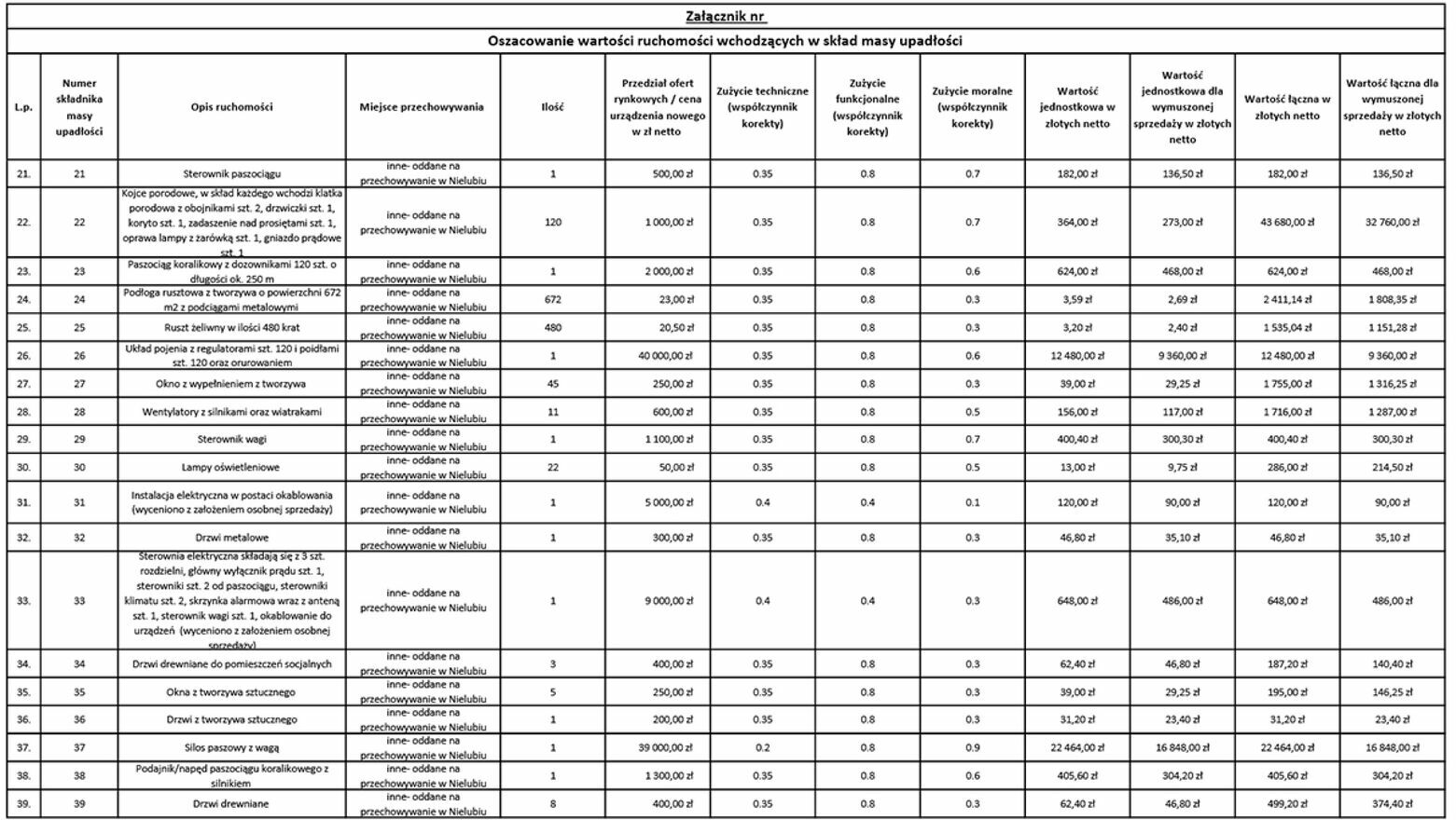 Łączna cena wywoławcza oferowanego do sprzedaży majątku stanowi 75% oszacowania i wynosi 319 621,11 zł netto.