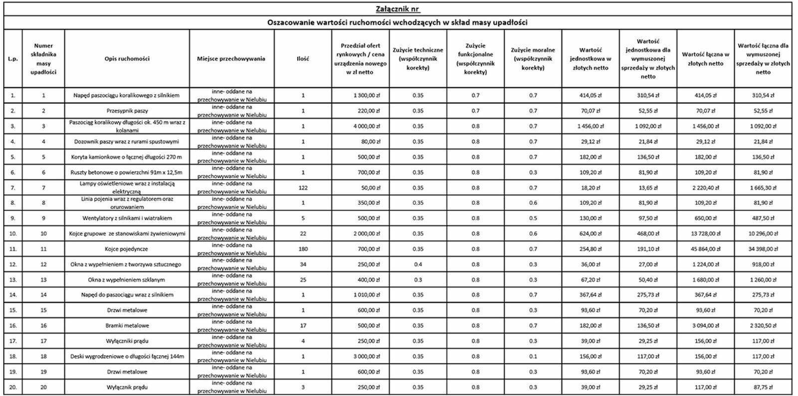 OGŁOSZENIE O SPRZEDAŻYSyndyk masy upadłości zaprasza do składania ofert na zakup ruchomości stanowiących wyposażenie chlewni – zlokalizowanych w miejscowości Nielub, w powiecie wąbrzeskim, w gminie Ryńsk.